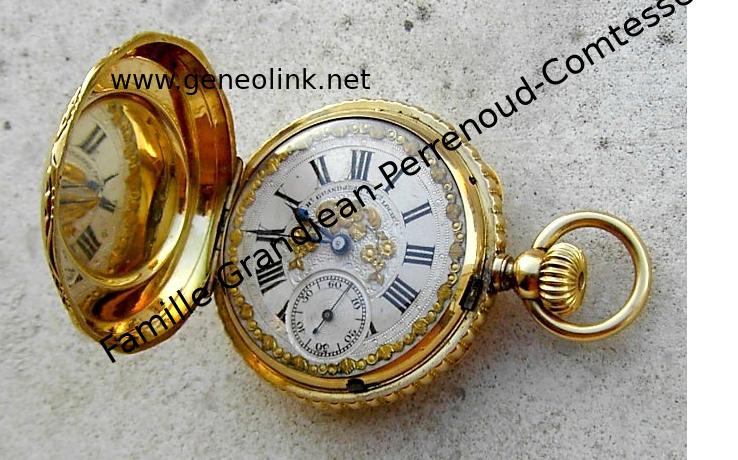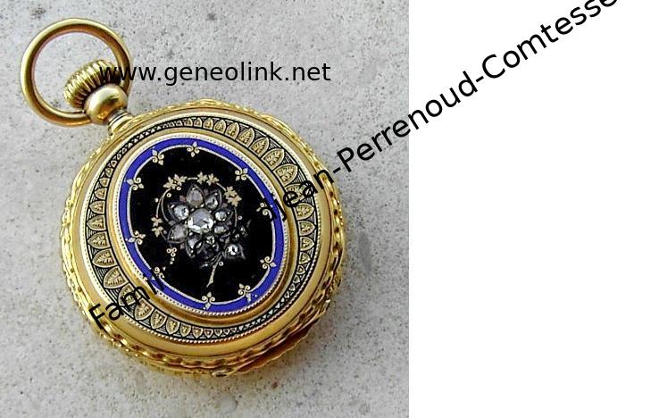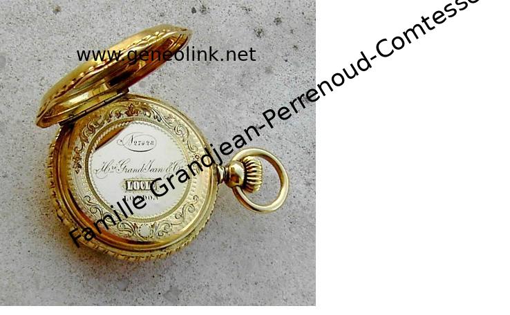Henri Tell GRANDJEAN-PERRENOUD-COMTESSE, négociant (en 1860) et fabricant d'horlogerie, fils de Lucien GRANDJEAN-PERRENOUD-COMTESSE et Elise Frédérique Louise CARTIER, naquit le 23 juillet 1833 à LA CHAUX-DE-FONDS, -, Neuchâtel, Suisse et mort le 3 août 1868 à LE LOCLE, -, Neuchâtel, Suisse à l’âge de 35 ans. Il a épousé Emma Emilie GUINAND, fille de Henri Louis GUINAND et Rosine LOHME, le 7 mai 1856 à LE LOCLE, -, Neuchâtel, Suisse. Elle naquit le 1 octobre 1834 à LE LOCLE, -, Neuchâtel, Suisse et morte le 8 mars 1911 à LA CHAUX-DE-FONDS, -, Neuchâtel, Suisse à l’âge de 76 ans.