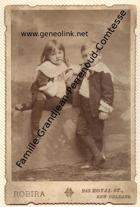 Georges Henri GRANDJEAN-PERRENOUD-COMTESSE, ingénieur CIVIL, fils de Henri GRANDJEAN-PERRENOUD-COMTESSE et Reine Mélina « Mélina » PERRENOUD, naquit le 2 juillet 1849 à LA CHAUX-DE-FONDS, -, Neuchâtel, Suisse et mort le 17 juin 1900 à NEW ORLEANS, -, LOUISIANE, USA à l’âge de 50 ans. Il a épousé Francine Joséphine FRÉMAUX, fille de Léon Joseph FRÉMAUX et Flore Caroline Marion DE MONTILLY, le 24 avril 1879 à NEW ORLEANS, -, LOUISIANE, USA. Elle naquit le 3 août 1852 à DONALDSONVILLE, -, Louisiane, USA.