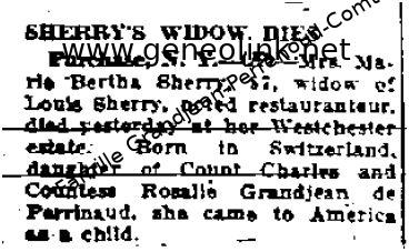 Marie Bertha GRANDJEAN-PERRENOUD-COMTESSE, fille de Charles Vital GRANDJEAN-PERRENOUD-COMTESSE et Sylvie FAIGAUX, naquit le 29 novembre 1853 à LE LOCLE, -, Neuchâtel, Suisse et morte le 1 juillet 1941 à Purchase, Westchester, NY, USA à l’âge de 87 ans. Elle a épousé Louis Michael SHERRY, fils de Henry SHERRY et Mary Ann MULLEN, le 3 septembre 1877 à NEW YORK, Manhattan, New York, USA. Il naquit le 6 juin 1853 à Richford, VT, USA et mort le 10 juin 1926 à Ambassador Hotel, Manhattan, New York, USA à l’âge de 73 ans.