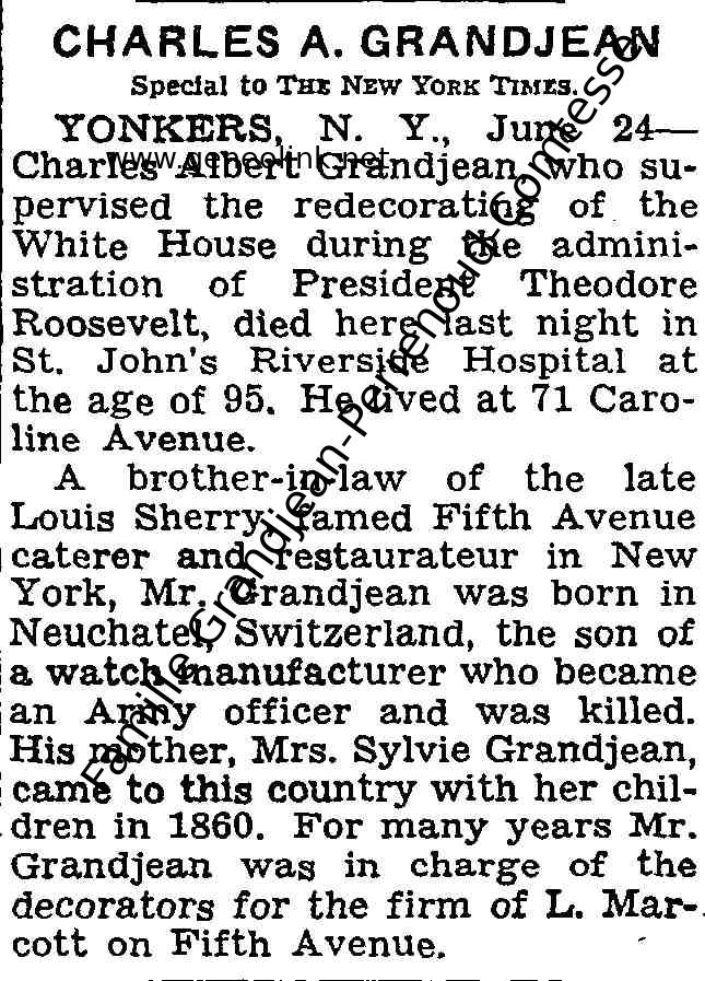 Charles Albert GRANDJEAN-PERRENOUD-COMTESSE, décorateur, fils de Charles Vital GRANDJEAN-PERRENOUD-COMTESSE et Sylvie FAIGAUX, naquit le 19 avril 1852 à LE LOCLE, -, Neuchâtel, Suisse et mort le 25 juin 1946 à New York, -, New York, USA à l’âge de 94 ans. Il a épousé Marie Louise CHAMPAGNE, fille de John CHAMPAGNE et Marie MASON, le 1 mai 1874 à New York, -, New York, USA. Elle naquit en 1853 à New York, -, New York, USA.