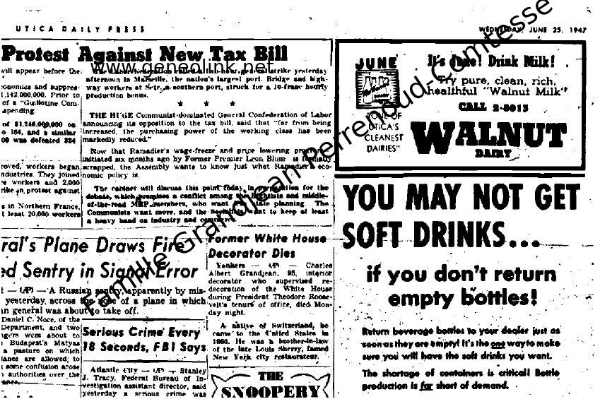 Louis Arthur GRANDJEAN, fils de Albert Nicholas GRANDJEAN et Jessie Elizabeth OLIVER, naquit le 13 novembre 1910 à USA et mort le 1 avril 1984 à Atlantic Highlands, Monmouth, New Jersey, USA à l’âge de 73 ans.