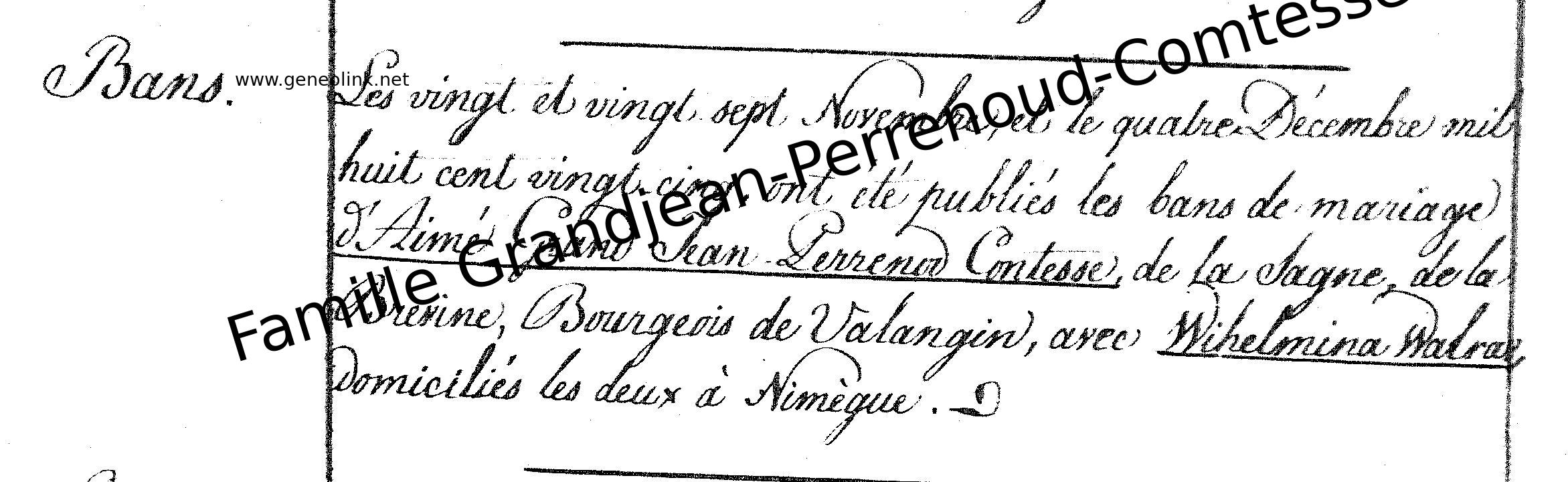 Aimé GRANDJEAN-PERRENOD-COMTESSE, sergent Major, fils de Simon GRANDJEAN-PERRENOUD-COMTESSE et Julie PETREMAND, naquit le 5 février 1792 à LES PONTS-DE-MARTEL, -, Neuchâtel, Suisse et mort le 24 octobre 1830 à BERGHEM, -, -, Belgique à l’âge de 38 ans. Il a épousé Jacoba Wilhelmina WALRAAVEN en novembre 1825 à NIMÈGUE, -, Gueldre, Pays-Bas. Elle naquit en 1801.