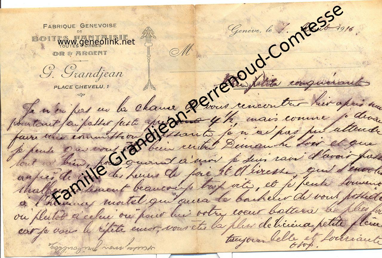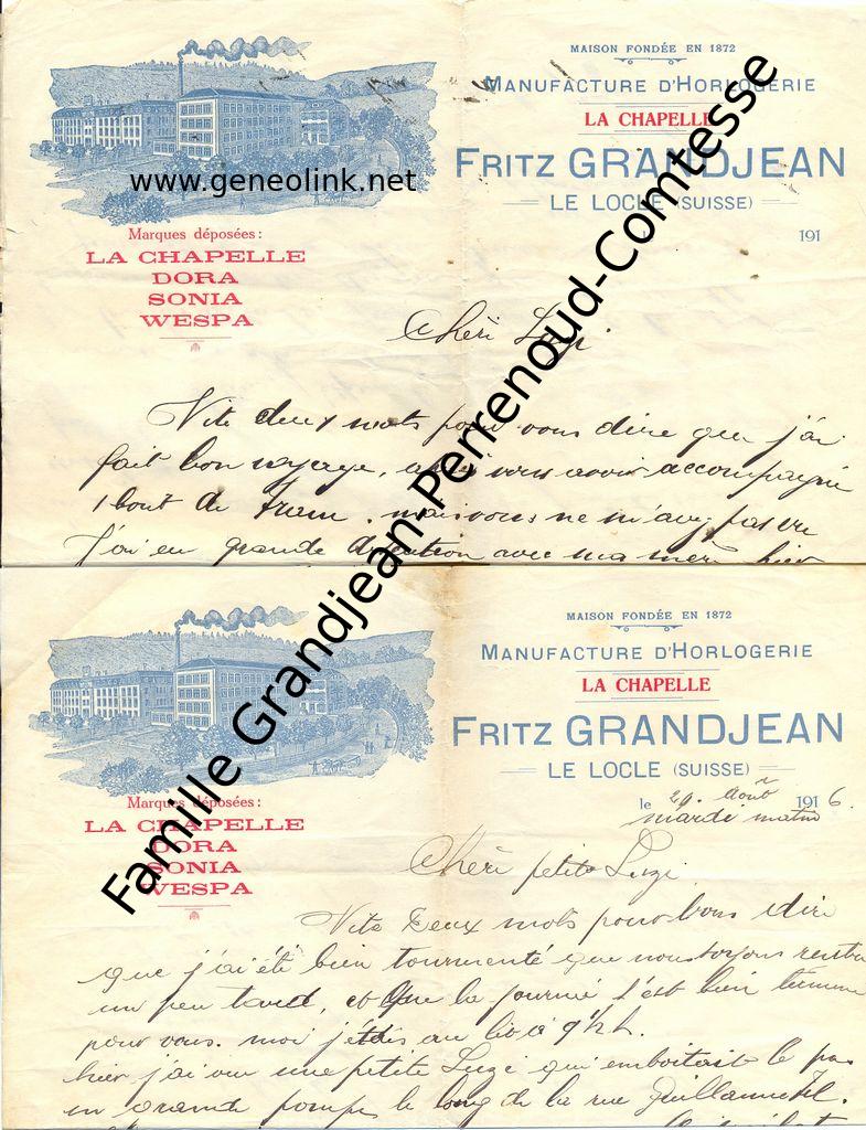 Georges Edmond GRANDJEAN-PERRENOUD-COMTESSE, horloger mécanicien (en 1918), fils de Fritz Henri GRANDJEAN-PERRENOUD-COMTESSE et Julie Cécile CHATELAIN, naquit le 10 février 1874 à LE LOCLE, -, Neuchâtel, Suisse et mort le 9 juillet 1928 à EAUX-VIVES, , Canton de Genève, Suisse à l’âge de 54 ans. Il s'est marié 2 fois. La première fois, il épouse Appolonie Emilie DARD, fille de Aimable Clovis DARD et Marie Françoise GUINNARD, le 7 janvier 1911 à GENEVE, , Genève, Suisse. Elle naquit le 3 juin 1878 à , Doubs, Franche Comté, France. La deuxième fois, il épouse Rose Suzanne GOY, fille de Georges David GOY et Elise Adrienne GOLAY, le 27 octobre 1917 à GENEVE, -, -, Suisse. Elle naquit le 17 juin 1882 à VAULION, , Canton de Vaud, Suisse et morte le 29 janvier 1969 à THONEX, , Canton de Genève, Suisse à l’âge de 86 ans.