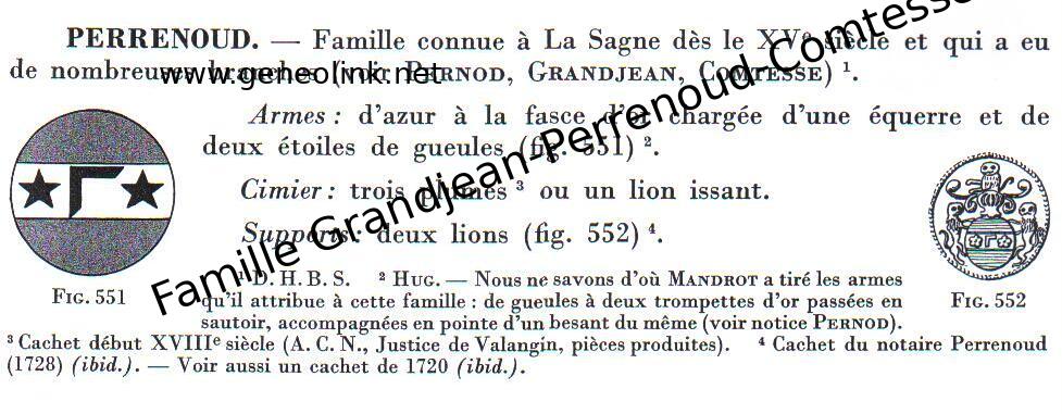 | Note | Quant à l'étymologie du patronyme PERRENOUD ou PERNOD, elle renvoie au prénom Pierre dont elle constitue un hypocoristique, c'est à dire un diminutif familier. Par le nom de baptême Petrus, du latin "petra", la pierre, la roche, ce prénom est issu du grec "petros", dans la même acception. Perrenoud - Anciennement Pernod, Perrenod. Dérivé neuchâtelois de Perrin, ancienne forme du prénom Pierre (latin Petrus, de petra, la pierre). Nombreuses branches: Perrenoud-dit-Martel, Perrenoud-André, Grandguillaume-Perrenoud ou Grand-Guillaume-Perrenoud, Grandjean-Perrenoud-Comtesse. Les Pernod qui ont exporté la fabrication d?absinthe du Val-de-Travers dans le Jura français descendent des Perrenoud, de même que les Perrenod émigrés au Etats-Unis. Autres formes: Pernot, Pernoud, Pernoux, Pernaux |