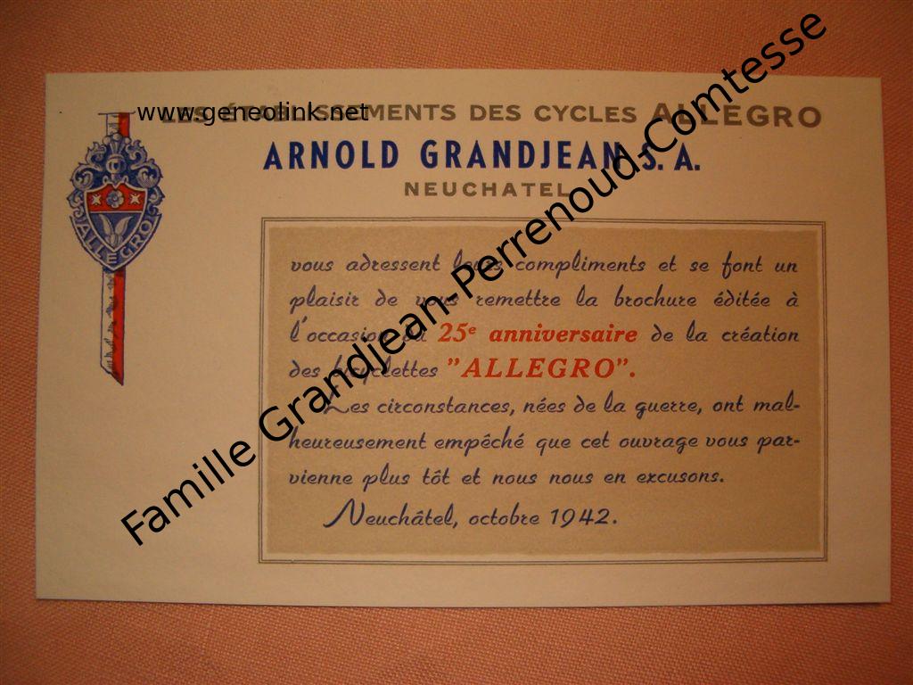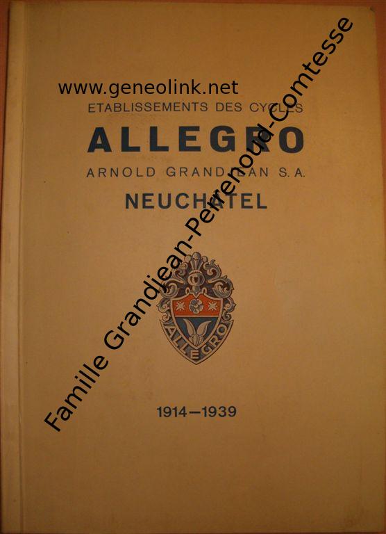 | Note | Au début de ce siècle, trois frères natifs de la vallée de la Sagne et des Ponts-de-Martel, fils d'un paysan-horloger, viennent à Travers travailler à l'usine de meubles Bachmann (actuel bâtiment Stoppani). Il s'agit des frères Ali, Jules et Arnold Grandjean-Perrenoud-Contesse. Se déplaçant à bicyclette et sportifs, ils prennent très rapidement le virus de la petite reine et se lancent dans la compétition. Ils gagnent de nombreuses courses et titres de Champion suisse dès 1910. La passion les poussent à ouvrir un petit commerce de bicycles à Travers, dans la petite maison en face du vieux pont, à la rue du Pont. Rapidement, ils développent leur affaire et installent à Fleurier, Place de la Gare, un commerce de bicycles, mécanique, et sport. Ils sont également membres actifs du vélo-club fleurisan Beau-Site. C'est là qu'ils construisent leur premier vélo et, en 1914, fondent la marque Allegro. Il semble que ce soit Georges Guye de Couvet qui leur dessine l'emblème actuel. Les 3 frères aînés sont rejoints par leurs frères Tell et Ulysse Grandjean. Par la suite, Jules s'en va à Vallorbe ou il ouvre également un commerce de cycles, motos, machines à coudre et articles de sport. Puis, il se déplace à Orbe. Ali migre à Neuchâtel et crée un commerce identique à la rue du Seyon. Arnold "descend" également à Neuchâtel et construit la première usine qui fabrique les célèbres vélos et motos Allegro. Ses deux petits frères, Tell et Ulysse, le suivent. Tell est pilote moto, sur Allegro, et remporte, dans les années 20, de nombreux titres en solo et en side-car accompagné de sa femme. Allegro fabrique des motos jusqu'à la dernière guerre. Par la suite, une nouvelle usine est construite à Marin et perpétue la renommée de la marque grâce à ses vélos de qualité, son équipe compétition et aux cyclomoteurs. Dans les années 90, la marque est cédée à un groupe Suisse-allemand. Francis Grandjean, fils d'Ulysse, introduit les 2 roues Peugeot en Suisse. Antoine Grandjean, petit fils, conseiller communal à Couvet, est également actif dans les deux roues. Daniel Grandjean, fils de Jules, revient à Couvet en 1941 pour travailler à la Dubied. Le virus du cycle et de la moto le prend. Il ouvre un premier commerce à la rue Emmer-de-Vattel, puis à la Place des Halles et enfin construit un garage, en1951, à la rue St. Gervais. Il est membre du MCB. Son fils Jean-Daniel se lance dans la compétition automobile dans les années 60 et 70 et obtient de bons résultats suisses et européens. Sont deuxième fils Philippe fait de la compétition moto dans les années 70. Il doit s'arrêter rapidement suite à un grave accident de circulation. Son troisième fils, Jacques Grandjean, membre MCB, participe, dès 1980, au challenge Honda ou il termine 2ème au général. Après encore un titre de vice-champion suisse en catégorie national, il accède rapidement au niveau international. Jacques participe 3 ans au championnat d'Europe et 2 ans au championnat du monde, soit jusqu'en 1985. |